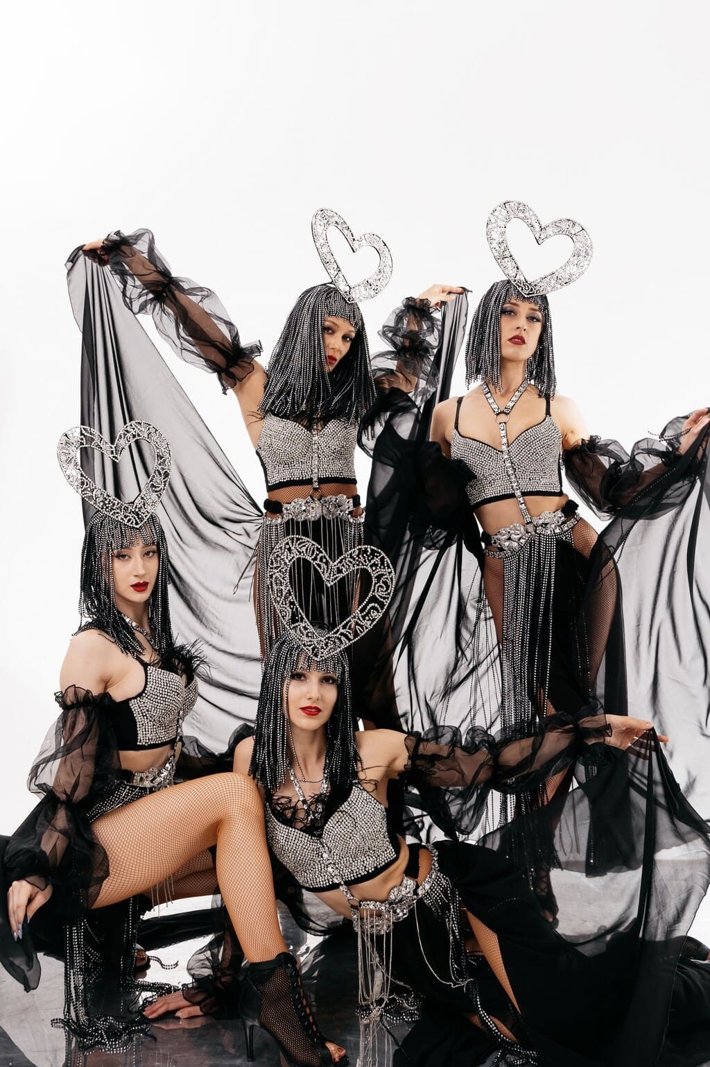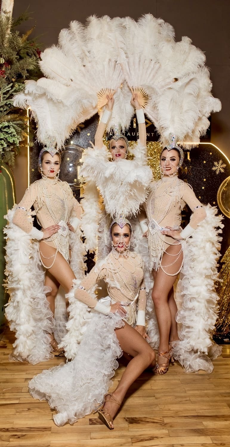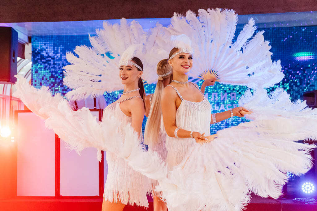 Костюмы танцовщиц могут быть дополнены светодиодными лампочками, если формат площадки позволяет сделать освещение минимальным.