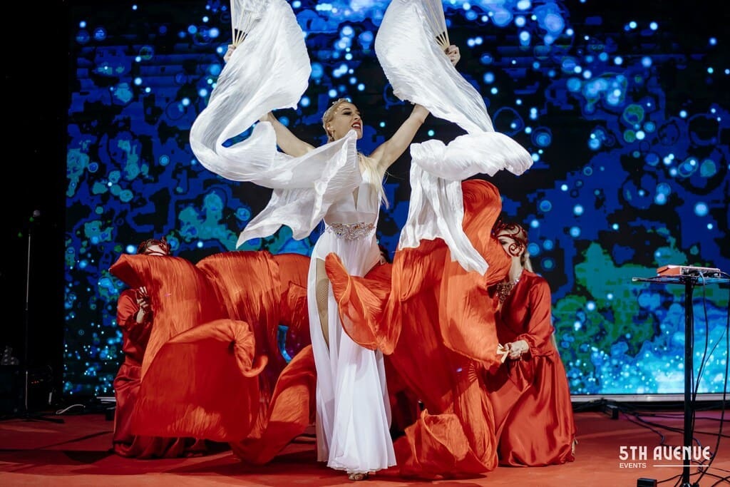 Красивый номер с огромным количеством красного шелка на сцене. В середине номера появляется балерина
